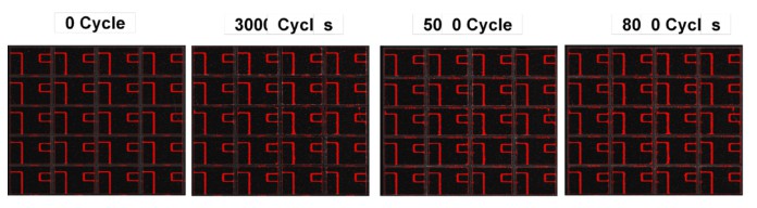 20個單獨的測試布局在熱沖擊測試之前和之后的SAM圖片(液體到液體-65℃到+150℃)。8000次循環(huán)后沒有明顯的退化,紅色表示蝕刻的隔離槽,它是測試布局的一部分。如果銅和釬焊金屬之間因熱沖擊而分層,紅色凹槽會變寬,這表明含銀AMB技術類似的方式充分利用Si3N4陶瓷的機械強度。