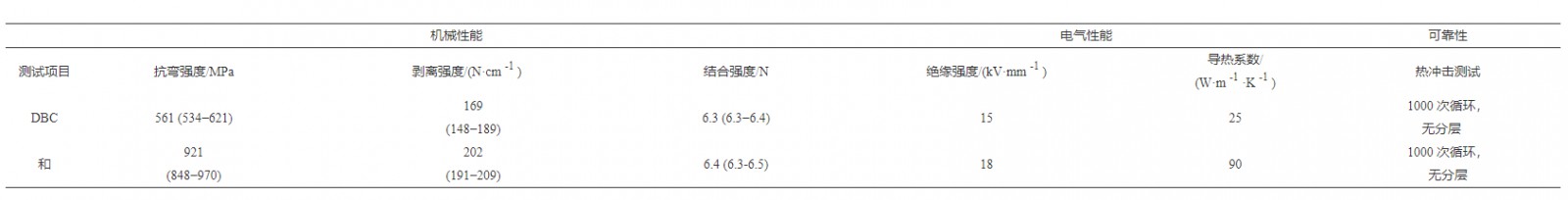 AMB陶瓷基板中的結(jié)合是通過(guò)陶瓷和活性金屬釬料在溫度下的化學(xué)反應(yīng)實(shí)現(xiàn)的,與傳統(tǒng)的AI2O3陶瓷基板相比,AMB中使用的Si3N4陶瓷具有更高的熱導(dǎo)率(>90W/mK 25℃),更接近硅的熱膨脹系數(shù)(2.6x10 -6 /K)。因此,AMB基板具有較高的粘合強(qiáng)度和可靠性。結(jié)合銀燒結(jié)工藝和大功率碳化硅芯片,帶有活性金屬涂層的AMB銅層可以實(shí)現(xiàn)高功率、更好的散熱和高可靠性的封裝模塊(可承受3000次熱沖擊),已廣泛應(yīng)用于電動(dòng)汽車、電力機(jī)車和高速列車。DBC和AMB的性能對(duì)比如圖1所示。