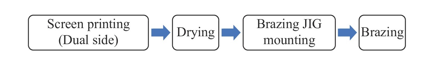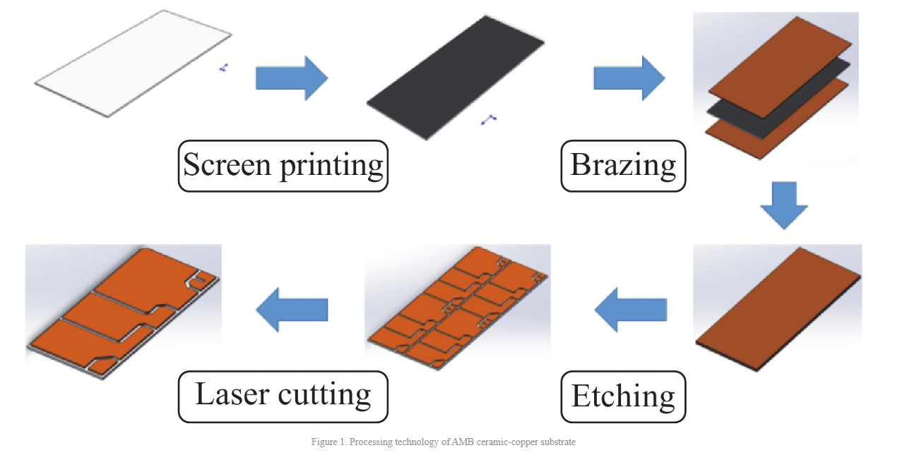DBC和AMB產(chǎn)品主要有兩點(diǎn)區(qū)別:第一,DBC產(chǎn)品的銅和陶瓷是直接粘合的,而AMB產(chǎn)品的銅和陶瓷是用活性金屬釬料釬焊的,需要額外的絲印工藝。釬焊前進(jìn)行,將活性金屬釬料均勻地置于陶瓷基板上;其次,DBC產(chǎn)品的銅是通過(guò)一次蝕刻形成的,而對(duì)于帶有額外金屬釬焊層的AMB產(chǎn)品,則需要進(jìn)行額外的蝕刻工藝去除釬料,通常采用氫氟酸。