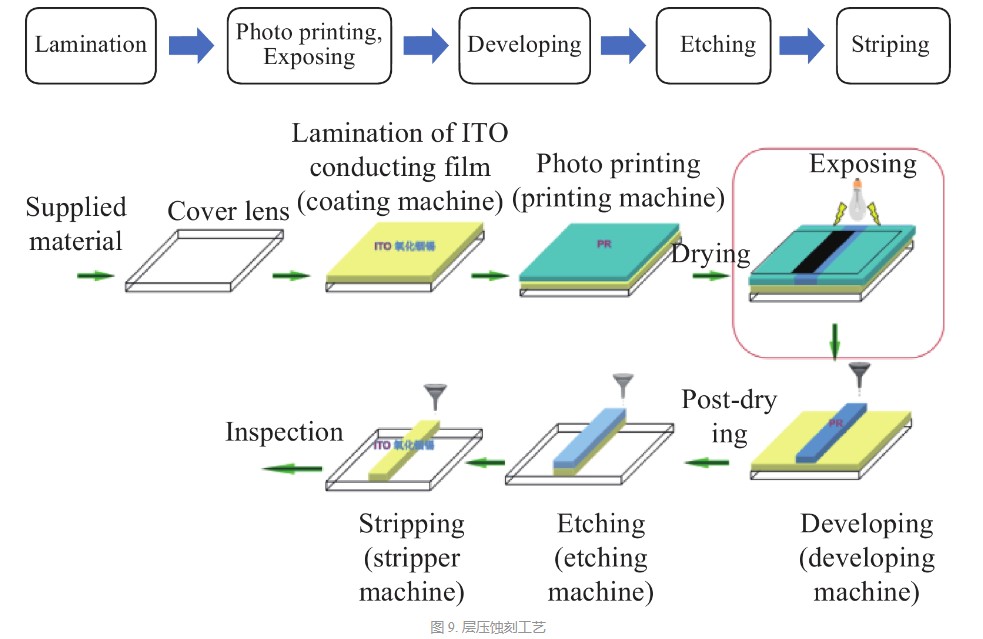 照片印刷:用ITO在母卡表面電鍍光刻膠材料并烘烤。由于光刻膠材料的高靈敏度,在工藝過(guò)程中需要黃光;