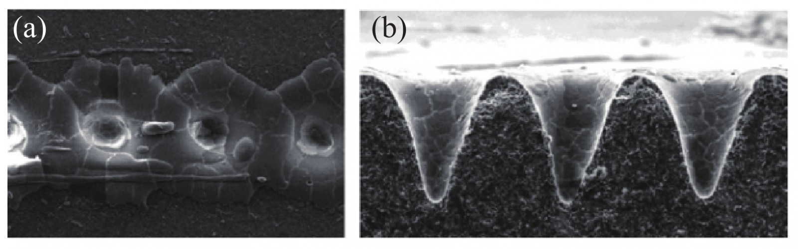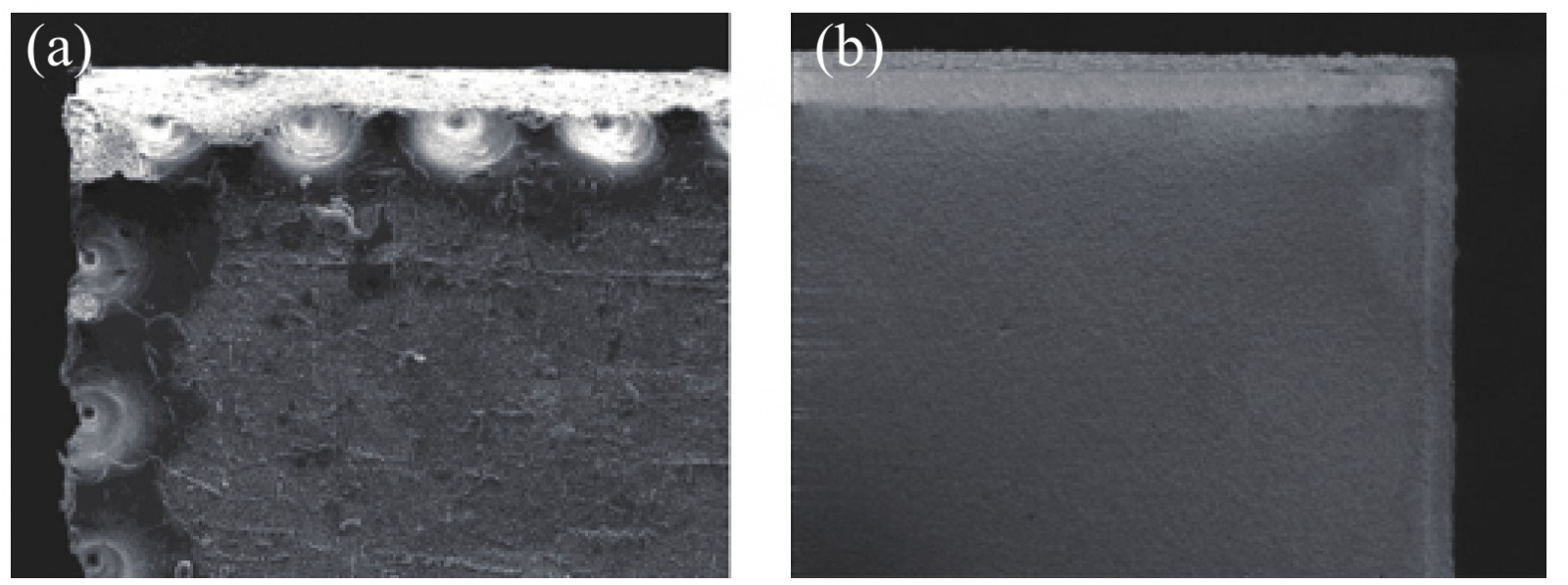 CO2激光的切割方式為單點(diǎn)沖擊,會(huì)對(duì)陶瓷基板造成深度損傷。如圖13 (a) 表面形貌和 (b) 表面斷面在單點(diǎn)沖擊下的 SEM 照片。