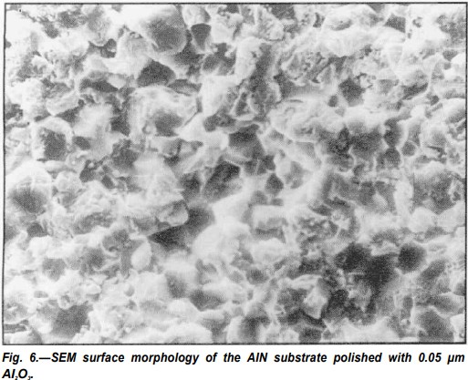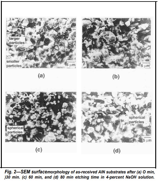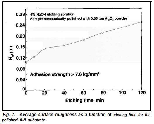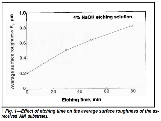 即使在室溫下,氮化鋁也會與氧化環(huán)境發(fā)生反應(yīng)。單晶氮化鋁在室溫下暴露在空氣中一天會形成0.5到1厚的AI2O3氧化層。AI2O3陶瓷通常很難蝕刻,為了消除AI2O3在基板表面形成的可能影響,一些AIN基板在蝕刻前用0.05μm AI2O3粉末拋光。平均表面粗糙度為-0.10μm的拋光基板比收到的基板光滑得多,如圖1和圖2所示。分別如圖6和2a所示。圖7顯示了拋光氮化鋁陶瓷基板的平均表面粗糙度與蝕刻時(shí)間的函數(shù)關(guān)系,在比較圖。從圖1和圖7可以看出,經(jīng)過不同蝕刻時(shí)間后,經(jīng)過拋光的氮化鋁表面比收到樣品的表面要光滑得多。