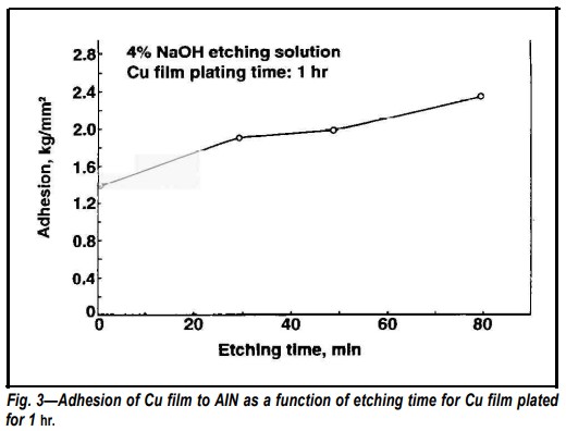 化學(xué)鍍銅在拋光的氮化鋁陶瓷基板上獲得了非常高的粘附強(qiáng)度,附著力大于附著力測試中使用的環(huán)氧樹脂的強(qiáng)度(即7.6kg/mm)。對于拋光的基板,斷裂發(fā)生在環(huán)氧樹脂而不是Cu-AIN界面,因此無法獲得真實(shí)附著力和表面粗糙度之間的相關(guān)性。蝕刻拋光可能會去除AI2O3層,并為后續(xù)蝕刻和電鍍提供新的、均勻的表面。然而,該機(jī)制有待進(jìn)一步調(diào)查,盡管如此,在這一點(diǎn)上可以得出結(jié)論,蝕刻前的拋光將Cu相對于氮化鋁的粘合強(qiáng)度提高到大于7.6kg/mm的值,這使得無電沉積銅成為氮化鋁陶瓷基板金屬化的良好候選者。