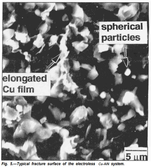 如圖3所示給出了作為蝕刻時(shí)間函數(shù)的Cu膜對氮化鋁的附著力,有兩種可能的附著力機(jī)制。一是化學(xué)鍵的形成,二是薄膜與底層基材之間的機(jī)械聯(lián)鎖。化學(xué)鍍銅液溫度約為25℃,對于化學(xué)鍵合來說太低了。因此,普遍認(rèn)為機(jī)械聯(lián)鎖是影響化學(xué)鍍膜相對于氮化鋁的粘合強(qiáng)度的主要因素。如圖4所示粘附強(qiáng)度和平均表面粗糙度之間的密切相關(guān)性,基材表面越粗糙,可用的機(jī)械聯(lián)鎖位置就越多。因此,正如預(yù)期的那樣,附著力隨著表面粗糙度Ra的增加而增加。如圖5所示附著力測試后化學(xué)鍍Cu-AIN試樣的斷裂表面。斷裂發(fā)生在Cu-AIN界面的AIN側(cè),表面殘留有一些細(xì)長的Cu膜,圖5還顯示了電鍍前AIN柱頂部的球形顆粒。需要進(jìn)一步調(diào)查以確定這些顆粒的化學(xué)性質(zhì)。